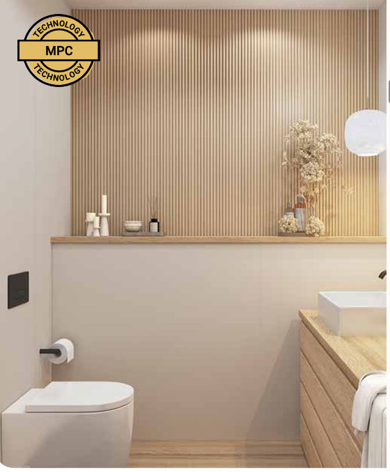 A panel magja modern MPC-ből (ásványi polimer kompozit) készült. Ezáltal a panel nemcsak kivételesen ütés- és karcálló , hanem mindenekelőtt 100%-ban vízálló is . Biztonságosan használható magas páratartalmú helyiségekben, például konyhában és fürdőszobában. Egy új stílusú fal nagyszerű kezdet.
